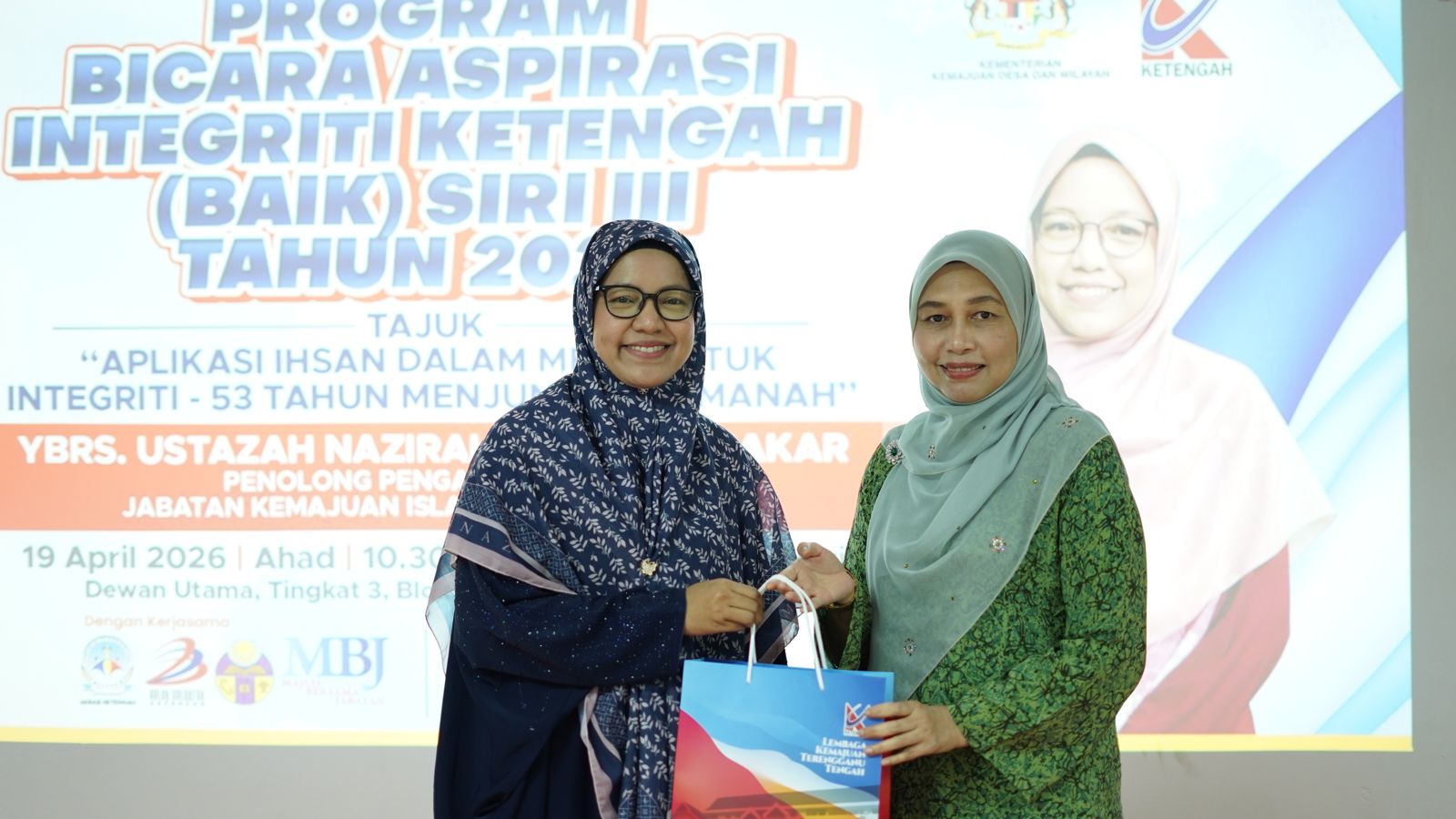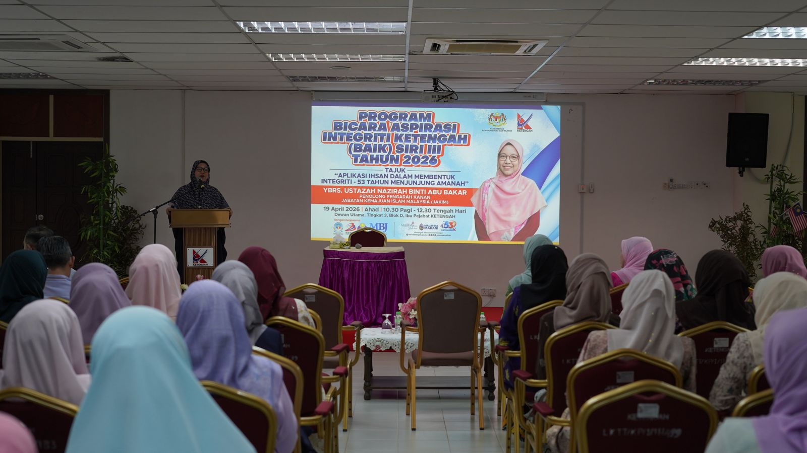 AL MUKTAFI BILLAH SHAH, DUNGUN, 19 April 2026 – Lembaga Kemajuan Terengganu Tengah (KETENGAH) terus komited dalam memperkukuh nilai integriti dalam kalangan warganya melalui penganjuran sesi ceramah bertajuk “Aplikasi Ihsan dalam Membentuk Integriti-53 Tahun Menjunjung Amanah” yang telah berlangsung di Dewan Utama, Ibu Pejabat KETENGAH, hari ini.