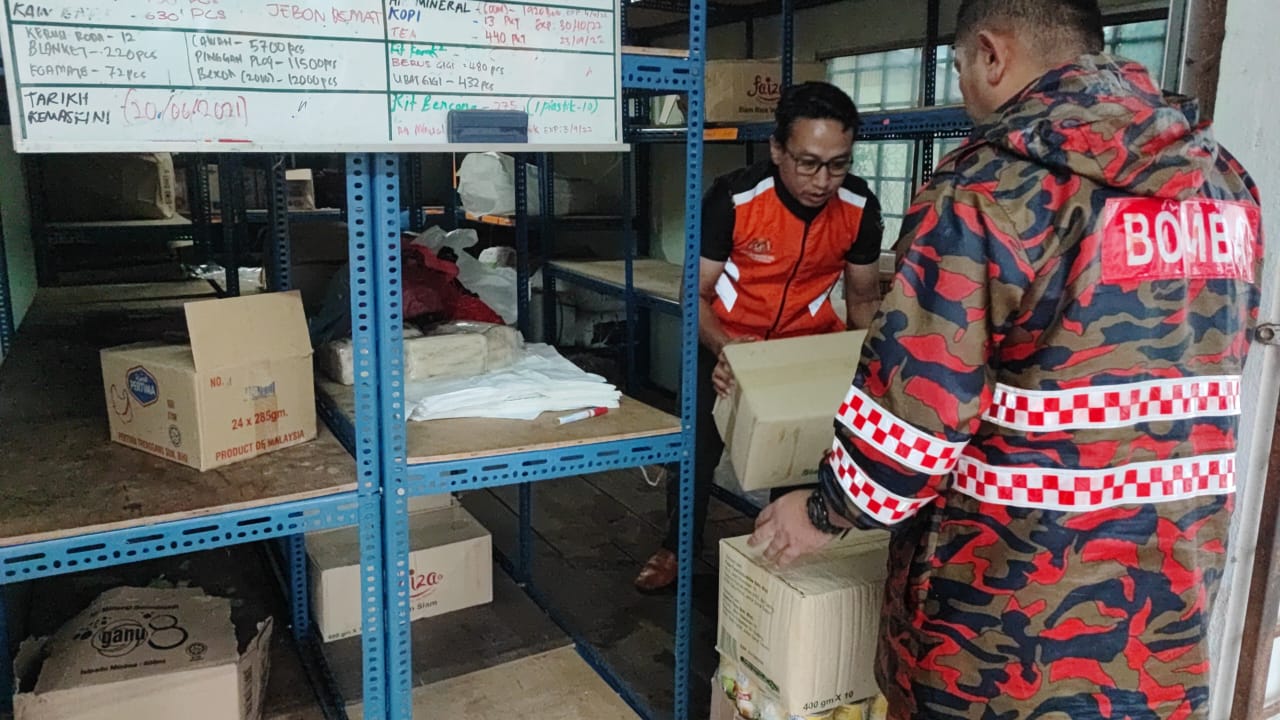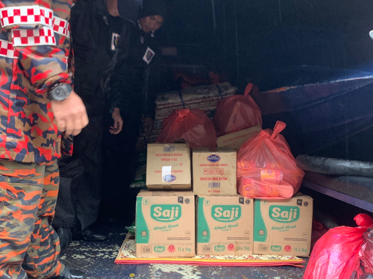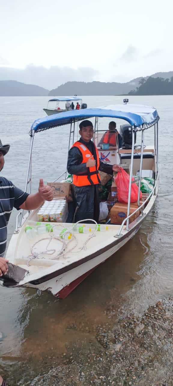 Sesi penghantaran barangan bantuan banjir dari Jabatan Kebajikan Masyarakat Hulu Terengganu (JKM) seperti beras, sardin, bihun, lampin pakai buang dan air mineral serta Kit Bantuan Bencana KETENGAH kepada pelancong yang terkandas di Tasik Kenyir telah diagihkan pada jam 6.30 petang tadi.