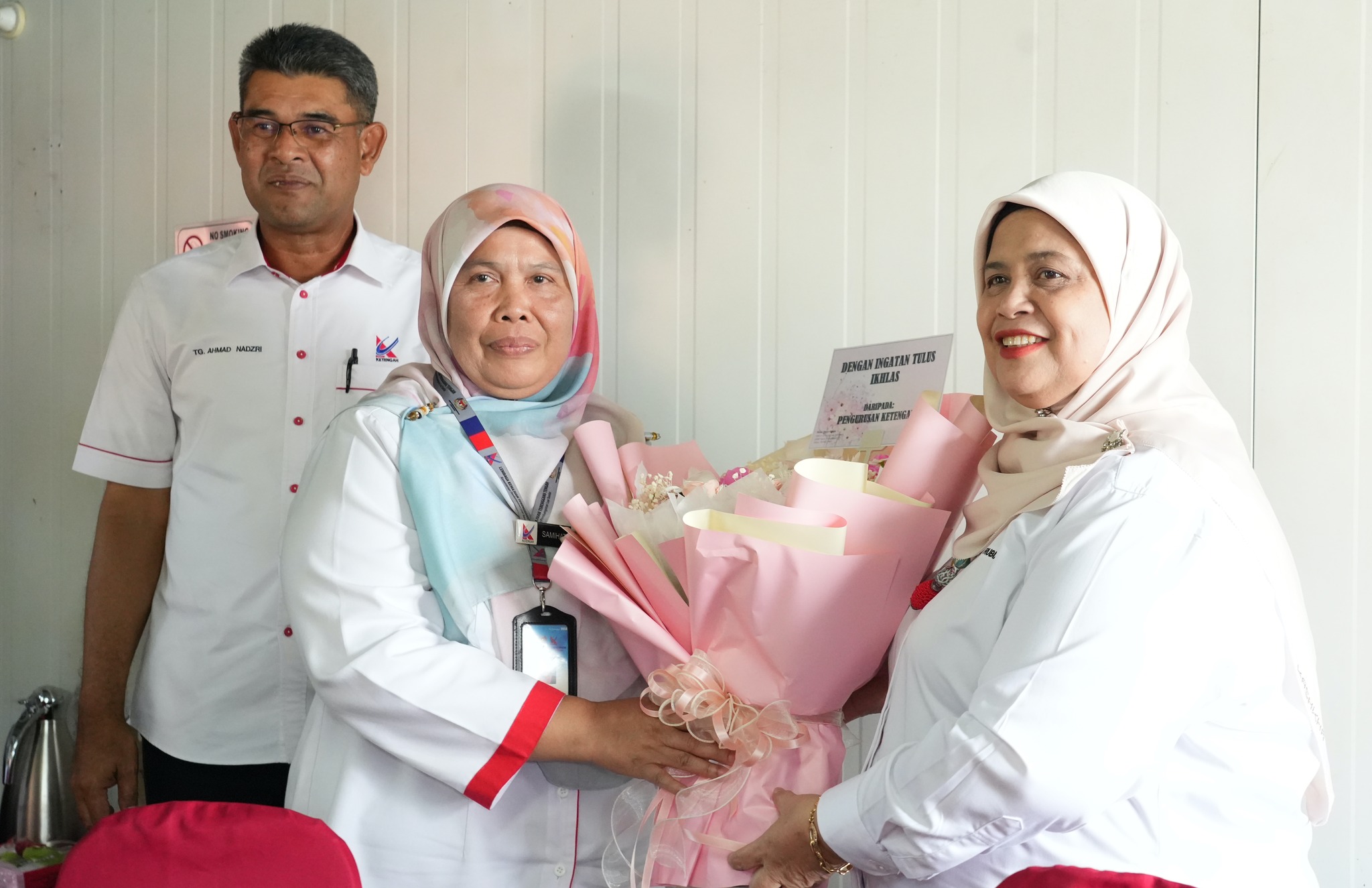 Turut diraikan ialah Puan Samihat binti Yunus, Pembantu Tadbir (Perkeranian/Operasi) Gred N2, Bahagian Kewangan dan Perakaunan, yang akan bersara pilihan pada 1 November 2025 setelah berkhidmat selama 29 tahun 11 bulan 15 hari.