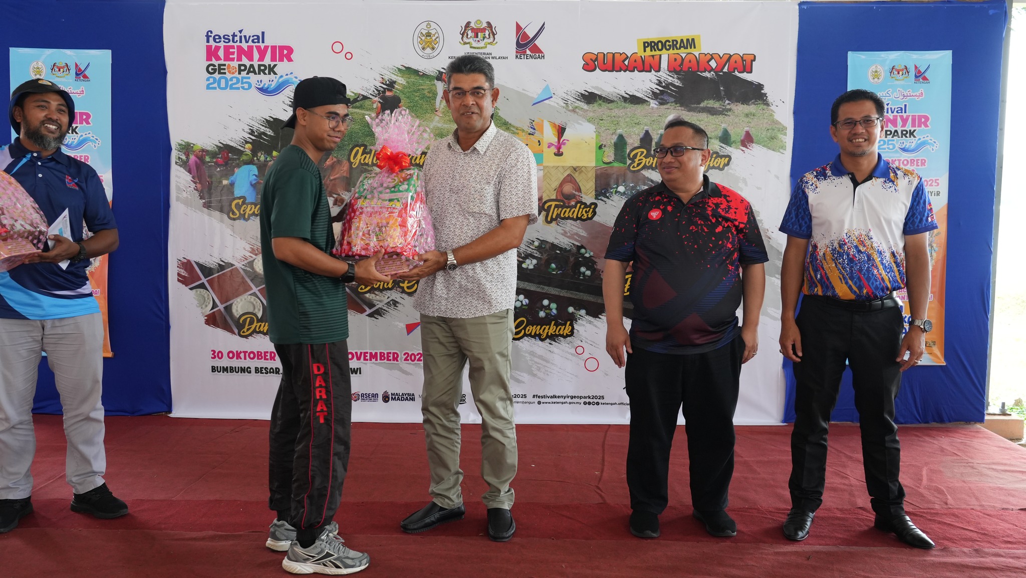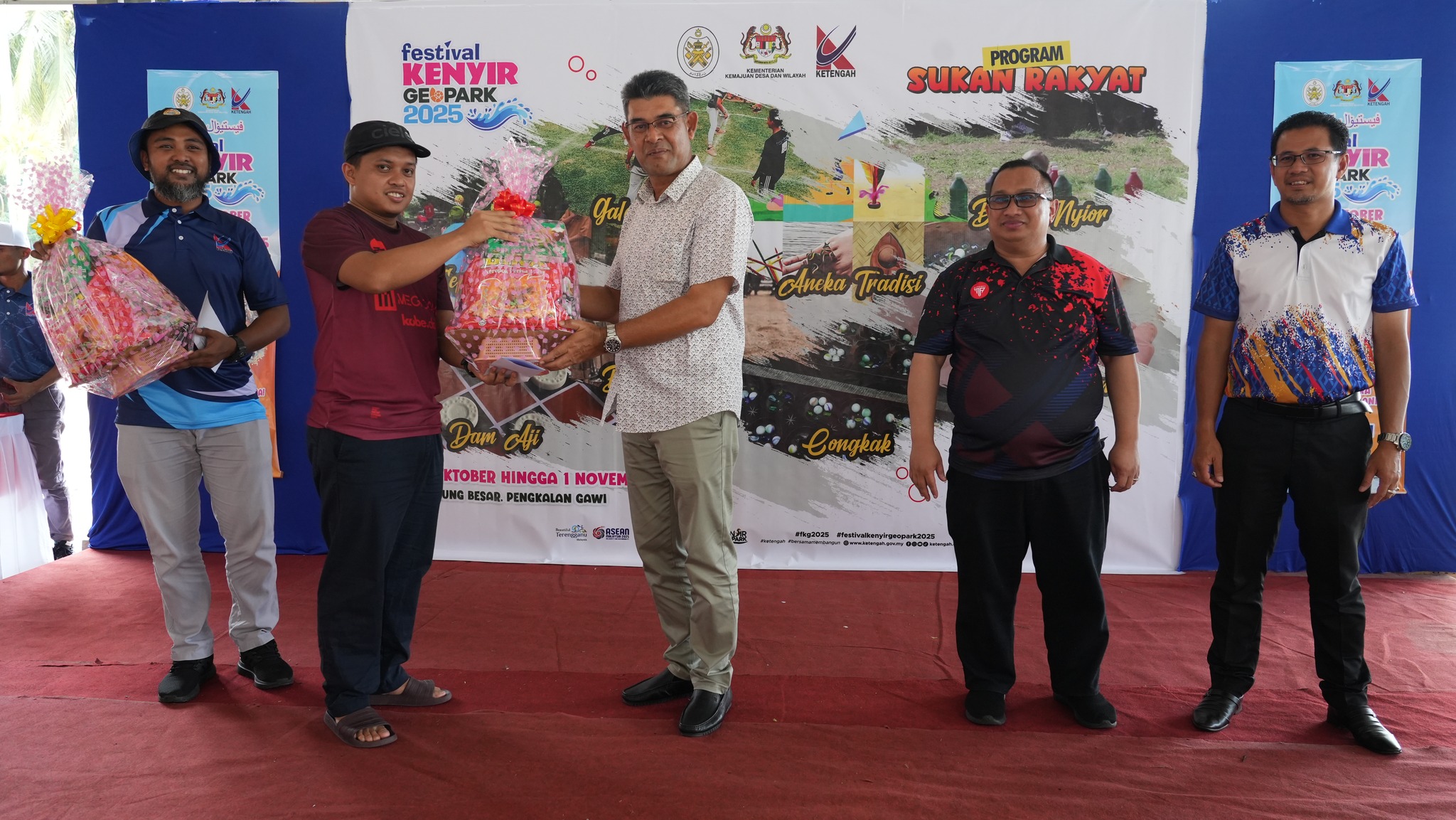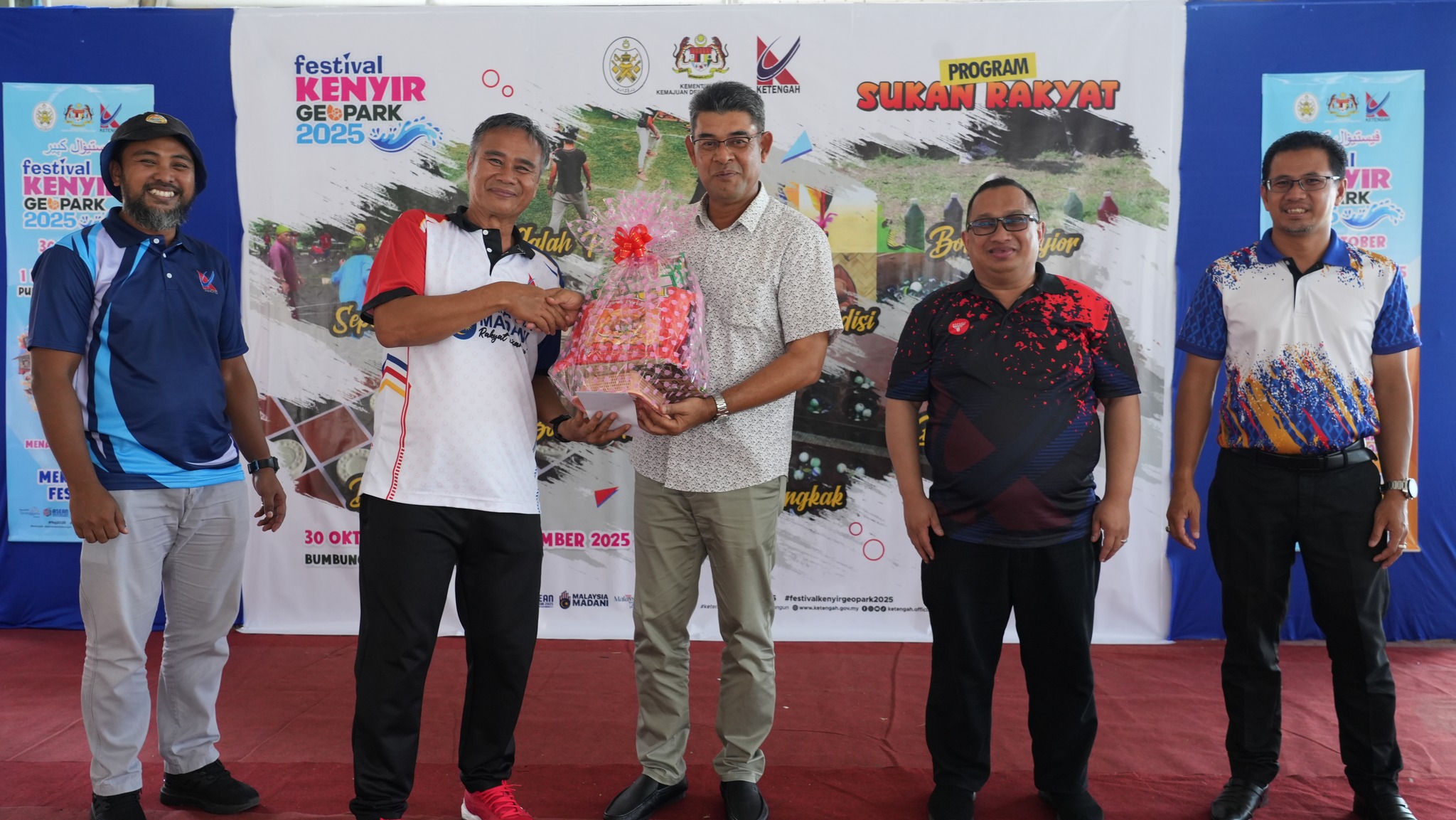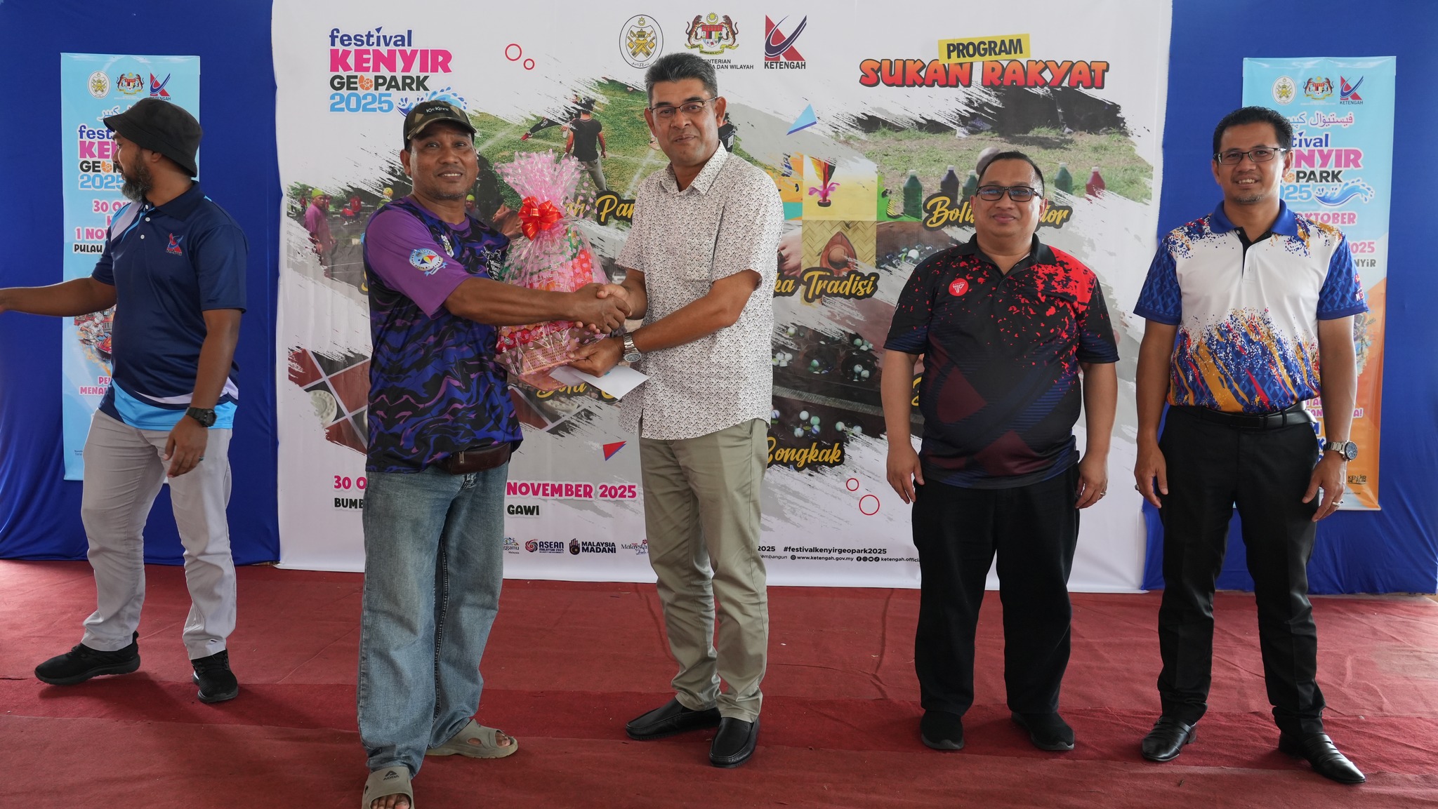 Acara Sukan Rakyat sempena Festival Kenyir Geopark 2025 berlangsung penuh meriah dengan pelbagai permainan tradisional seperti terompah gergasi, boling kelapa, dan galah panjang.