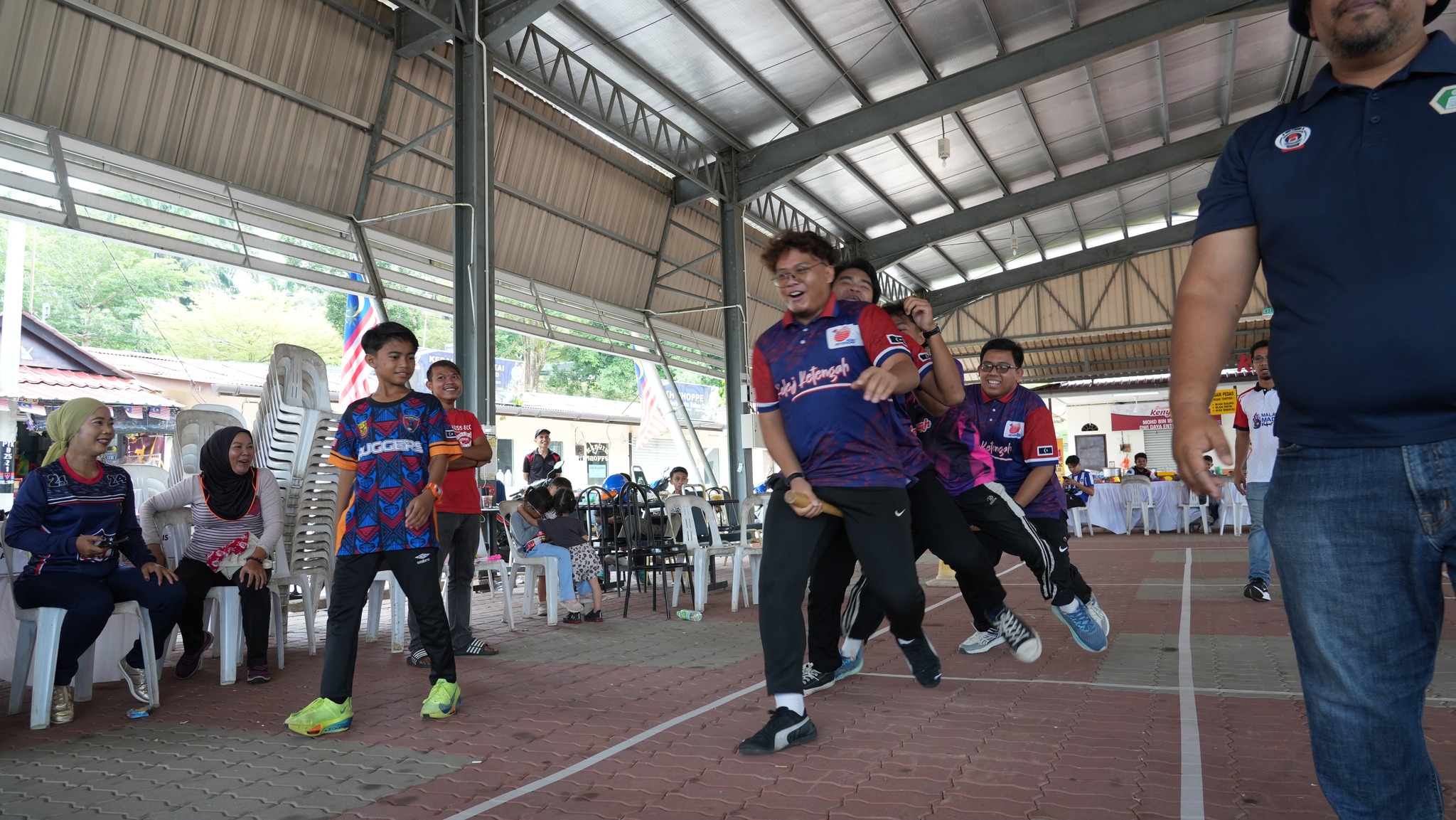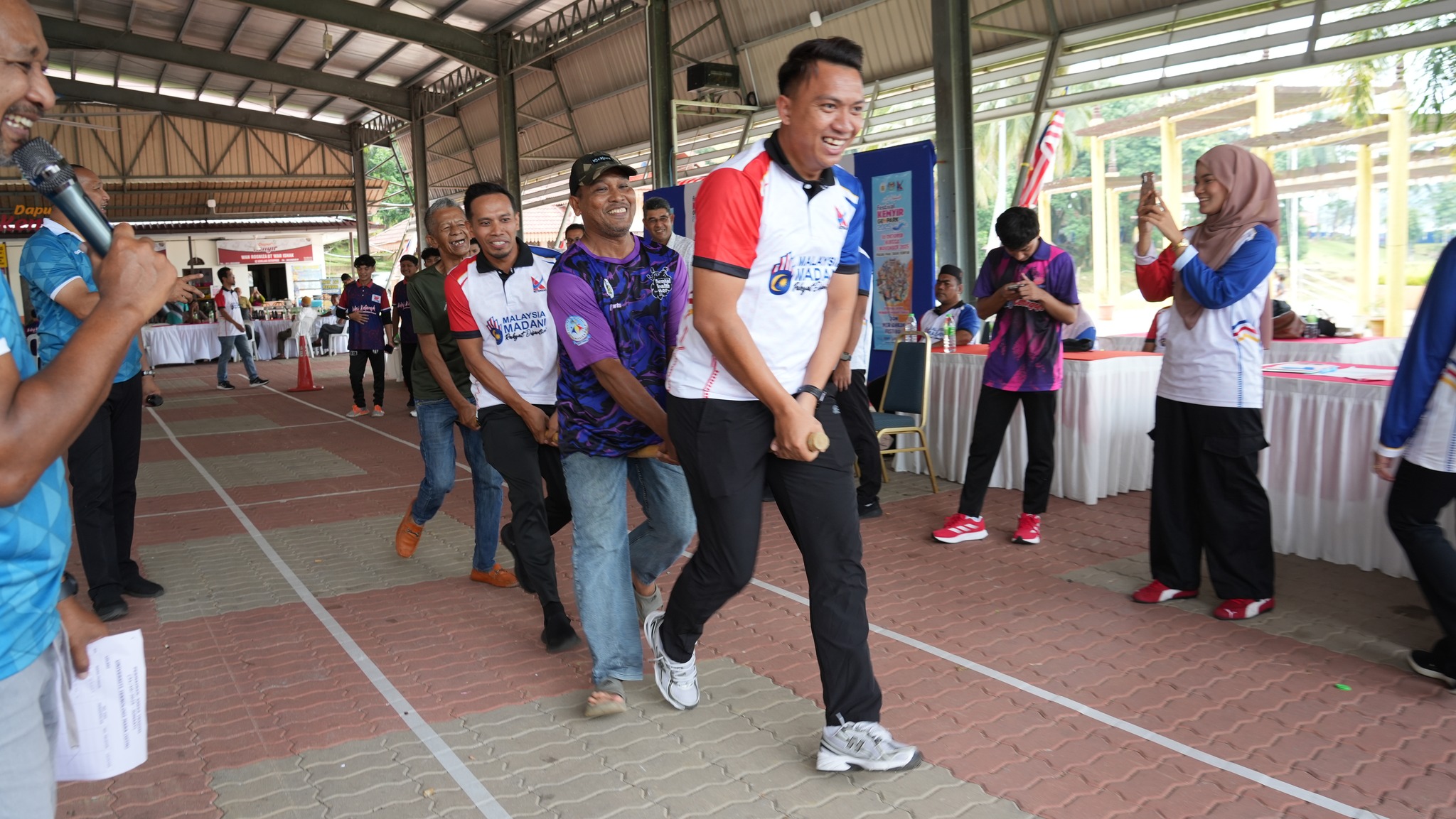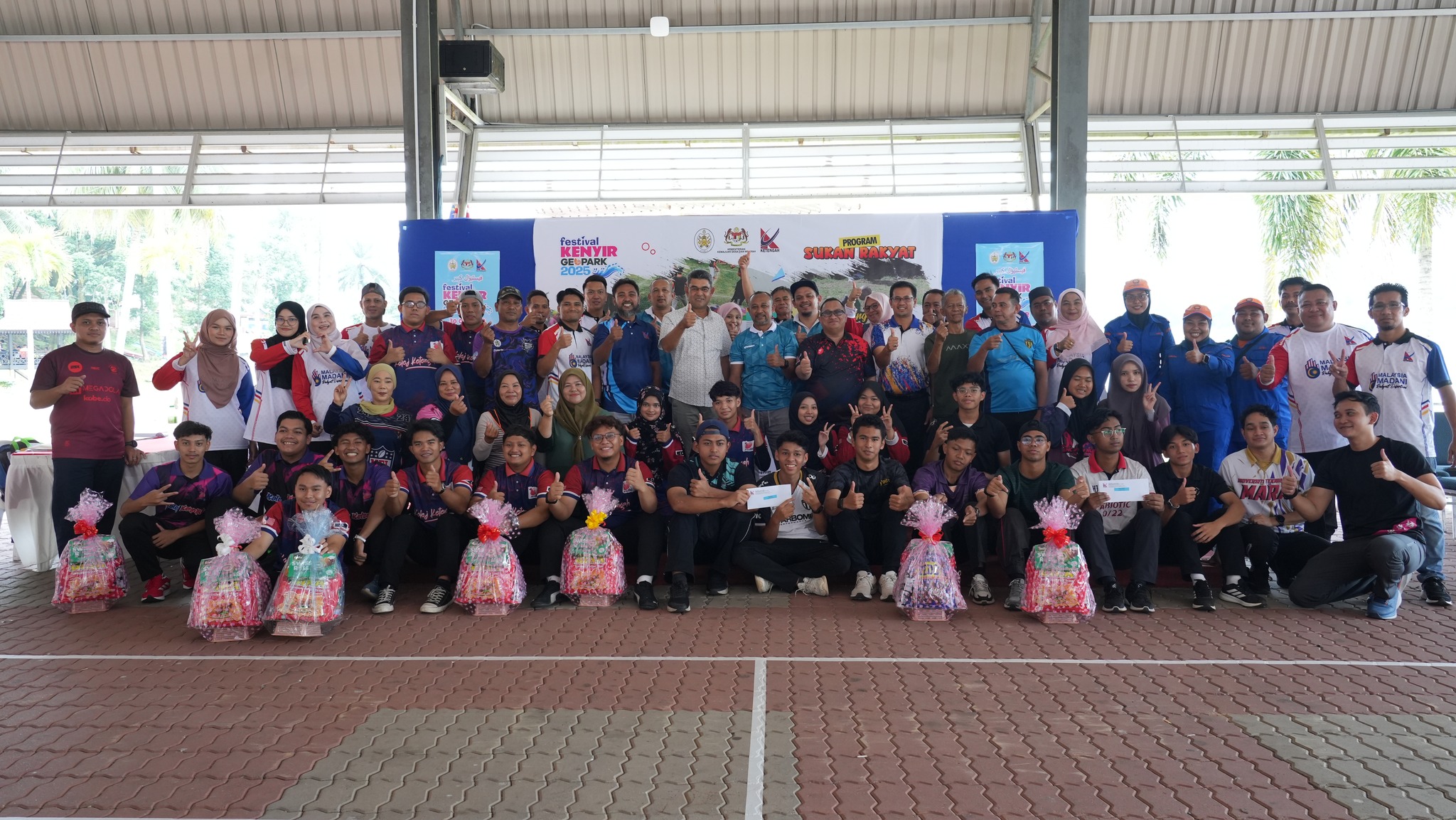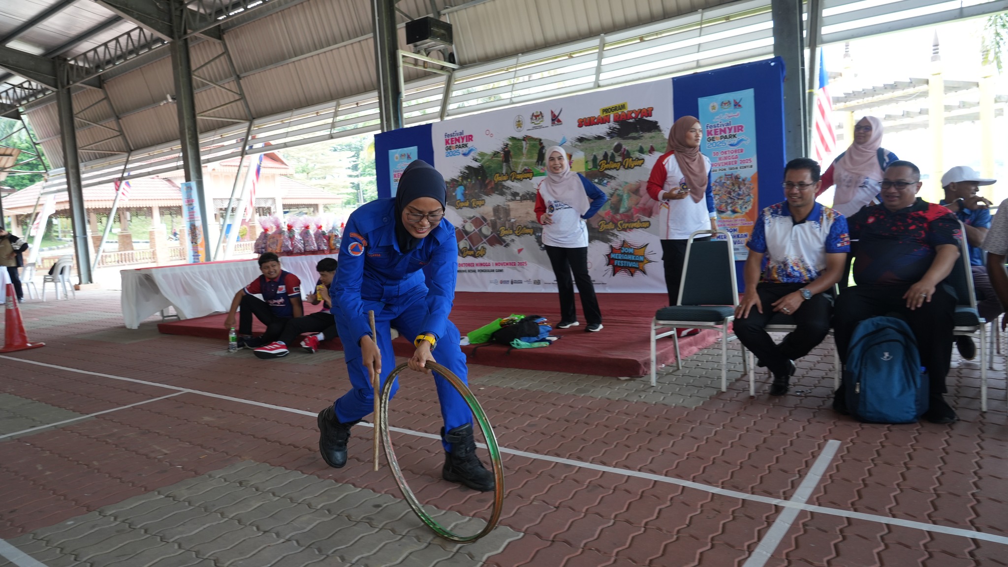 Acara Sukan Rakyat sempena Festival Kenyir Geopark 2025 berlangsung penuh meriah dengan pelbagai permainan tradisional seperti terompah gergasi, boling kelapa, dan galah panjang.